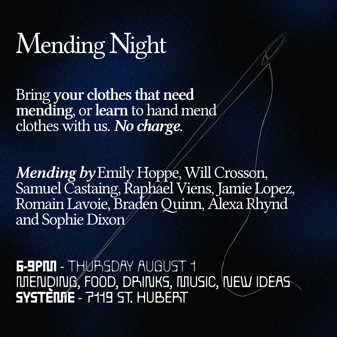 Menders are those who believe things can be fixed, maintained and improved through actions both individual and cooperative. Mending Night creates social context for a system of clothing repair and fashion culture which is maintained by regular mending and education in a shared physical space.